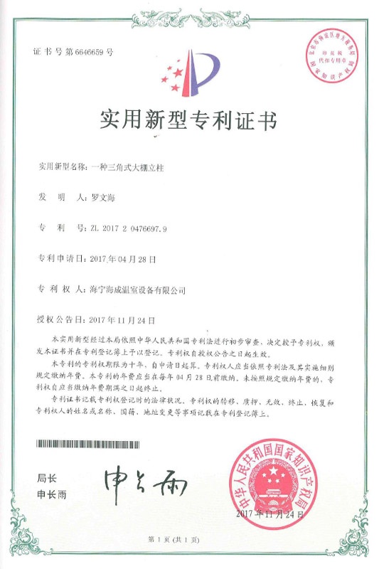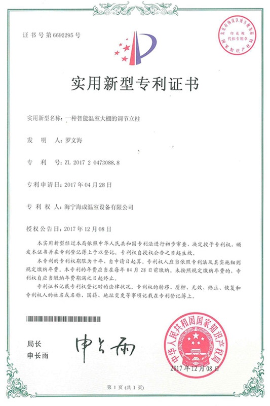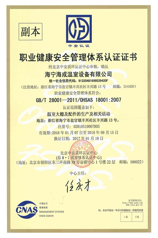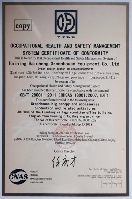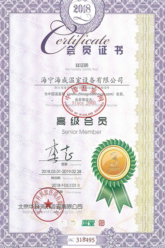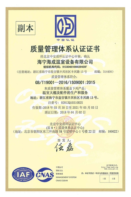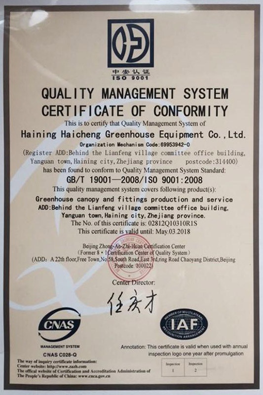 海寧海成溫室設(shè)備有公司位于浙江省海寧市鹽官鎮(zhèn),是一家集設(shè)計、生產(chǎn)、銷售、安裝為一體的農(nóng)業(yè)科技性公司。公司專業(yè)生產(chǎn)、制作溫室大棚已有數(shù)十年。本公司專注于經(jīng)營鋼管大棚、連棟大棚、鋁合金玻璃溫室及配套系統(tǒng),長期以來,公司秉承“以誠為本,以信立業(yè)”的宗旨為廣大客戶服務(wù),產(chǎn)品銷售到全國各地及海外市場,并得到了許多客戶的好評。公司已取得ISO9001質(zhì)量管理體系認(rèn)證證書,具有專業(yè)的質(zhì)量管理化制度,為了讓我們的客戶擁有輕松的項(xiàng)目實(shí)施體驗(yàn),我們還設(shè)置了專門的項(xiàng)目管理中心,采用專職的項(xiàng)目經(jīng)理負(fù)責(zé)制,為客戶全程跟進(jìn)項(xiàng)目。公司管理一直追求制度化、標(biāo)準(zhǔn)化,全體員工牢固樹立質(zhì)量意識,恪守各項(xiàng)規(guī)章制度,嚴(yán)格按照行業(yè)及國家有關(guān)規(guī)定執(zhí)行。